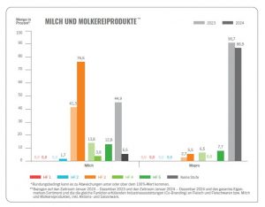 Neu hinzugekommen ist 2024 die Haltungsform 5, die im Milch- und Molkereisegment bereits einen beachtlichen Marktanteil erreicht: 12,8 % bei Milch und 7,7 % bei Molkereiprodukten.