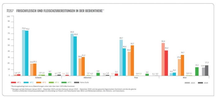 Besonders auffällig ist der Rückgang von Haltungsstufe 1 zugunsten höherer Stufen: Im SB-Regal sinkt der Anteil von 75,6 % (2023) auf 62,4 % (2024), während Stufe 3 im gleichen Zeitraum von 5,6 % auf 16,7 % steigt. An der Bedientheke zeigt sich ein ähnliches Bild: Haltungsstufe 1 fällt von 54,4 % auf 42,2 %, Stufe 3 wächst von 27,4 % auf 34,7 %. Diese Entwicklung verdeutlicht, dass Landwirte und Lebensmitteleinzelhandel bereit sind Schritte für mehr Tierwohl zu gehen, wenn die Verbrauchernachfrage dies rechtfertigt.