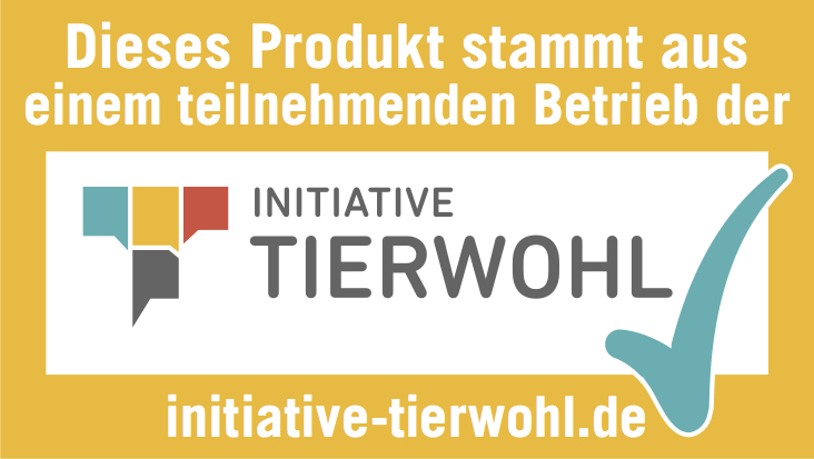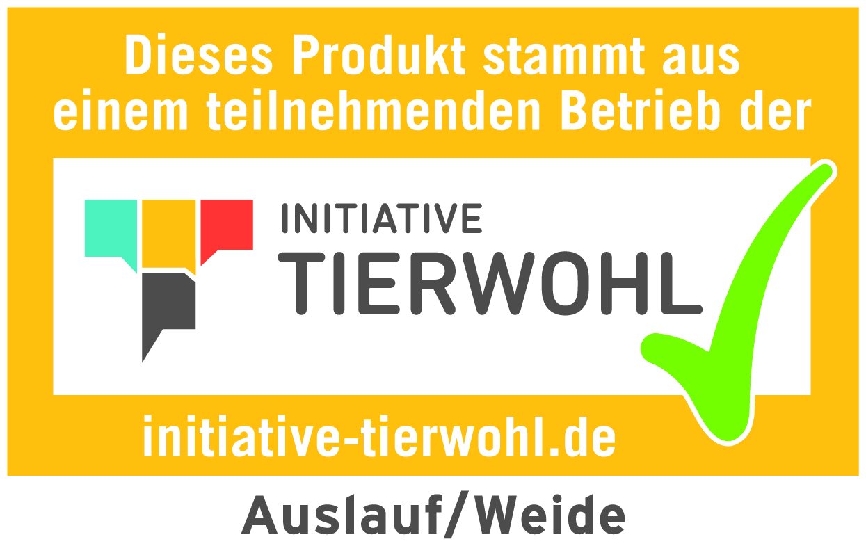 Das ebenfalls neue Produktsiegel für das Programm in der Haltungsformstufe 4 verfährt nach demselben Prinzip: auch hier macht der gelbe Rahmen die Zugehörigkeit zum ITW-Siegelsystem deutlich. Allerdings markieren hier ein grünes Häkchen und der Schriftzug „Auslauf/Weide“ unter dem gelben Rahmen die Einordnung in die Haltungsform Stufe 4.