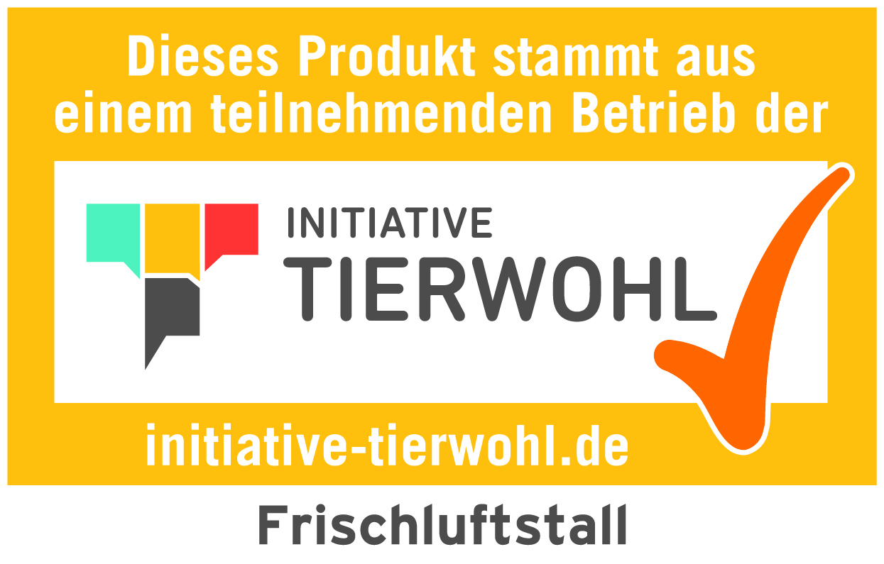 Das neue Siegel für das Programm „Initiative Tierwohl Frischluftstall“ erinnert mit dem gelben Rahmen an das bekannte ITW-Siegel mit dem blauen Haken, das Fleisch in der Haltungsform Stufe 2 kennzeichnet. Aber das neue Programmsiegel weist im Unterschied zum altbekannten einen orangefarbenen Haken auf, dessen Farbe eine Assoziation zur entsprechenden Haltungsform Stufe 3 – ebenfalls orange – hervorruft. Ferner ist zur eindeutigen Zuordnung der Schriftzug „Frischluftstall“ auf weißem Grund unterhalb des gelben Rahmens zu sehen.